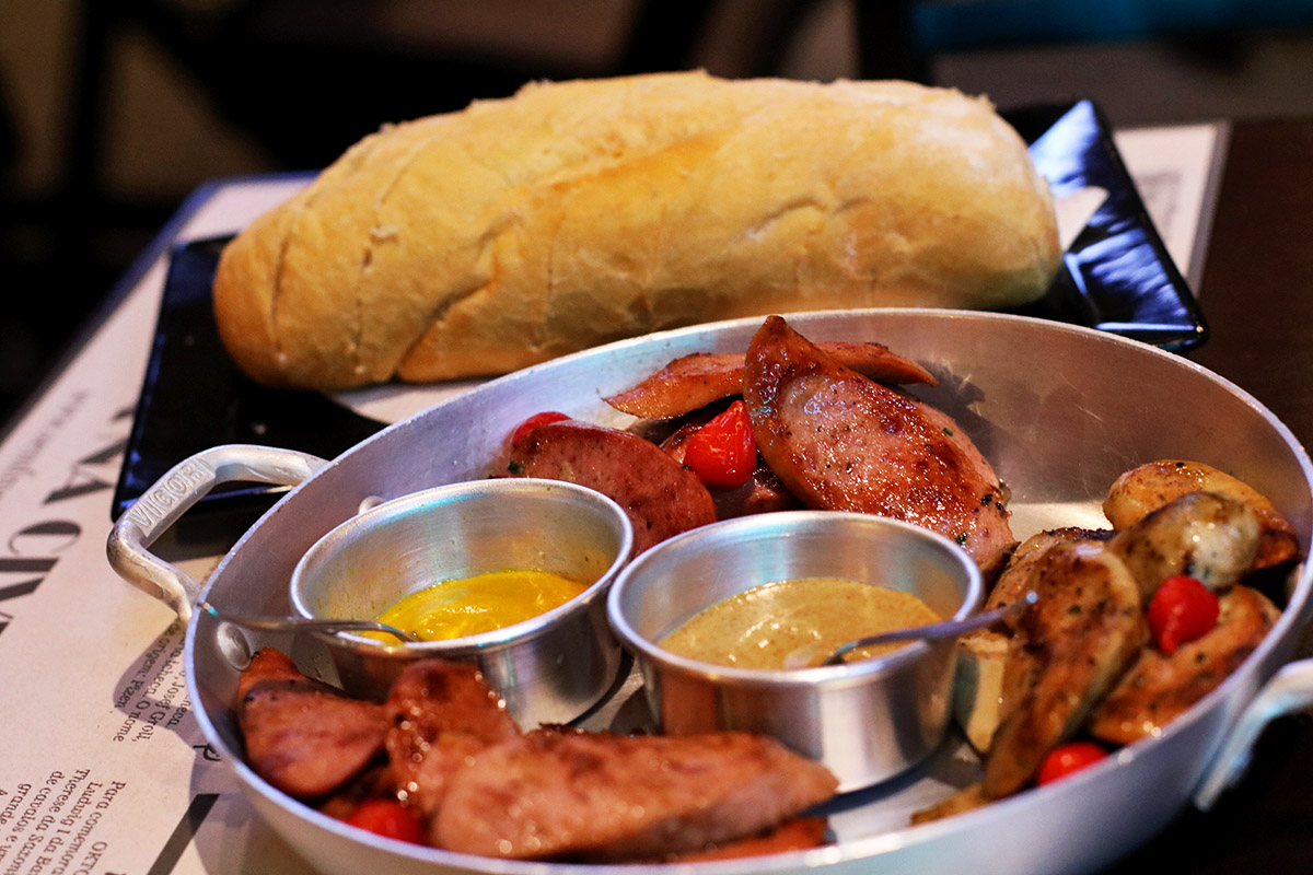 Já o cardápio de “comes” tem opções de porções, incluindo bolinhos de arroz, bacalhau, mandioca com carne seca, grão de bico com espinafre e coxinhas, além de 3 tipos de hambúrgueres, incluindo um vegetariano. Algumas inspirações internacionais como fajitas, nachos e as salsichas alemãs (nossa pedida, R$ 45), completam o menu, que está disponível no site da casa. Um ponto bastante positivo foi a água gelada, servida em garrafas de 1,5 L, sem qualquer custo. O preço dos chopes começa em R$ 5 e o bar tem ainda uma programação de música ao vivo.